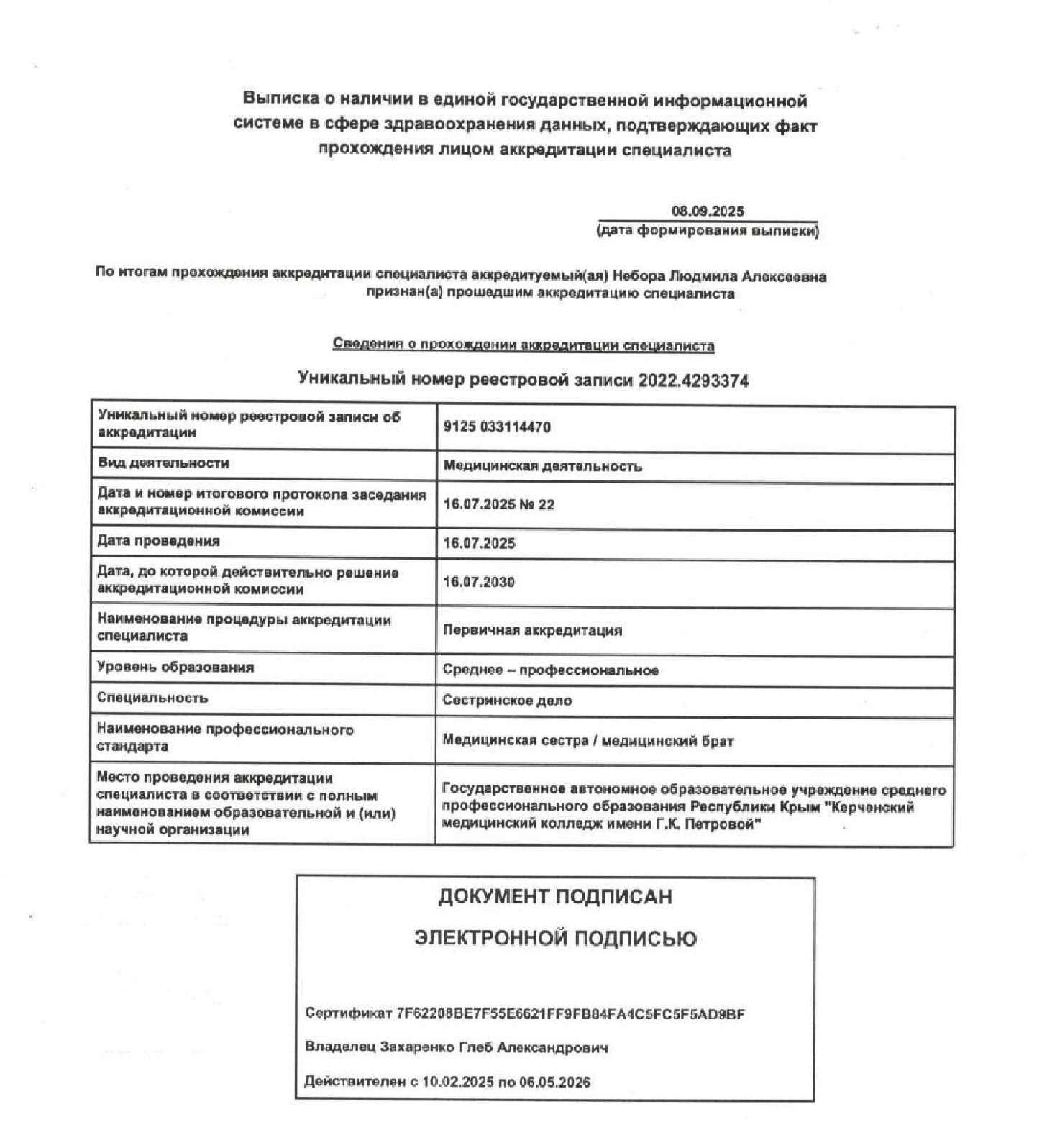 НАИМЕНОВАНИЕ УЧЕБНОГО ЗАВЕДЕНИЯ, ГОД ОКОНЧАНИЯ, №ДИПЛОМА, СПЕЦИАЛЬНОСТЬ:Государственное автономное образовательное учреждение среднего профессионального образования Республики Крым «Керченский медицинский колледж имени Г.К. Петровой, 2025 год, диплом №118204 0046528,по специальности «Сестринское дело»