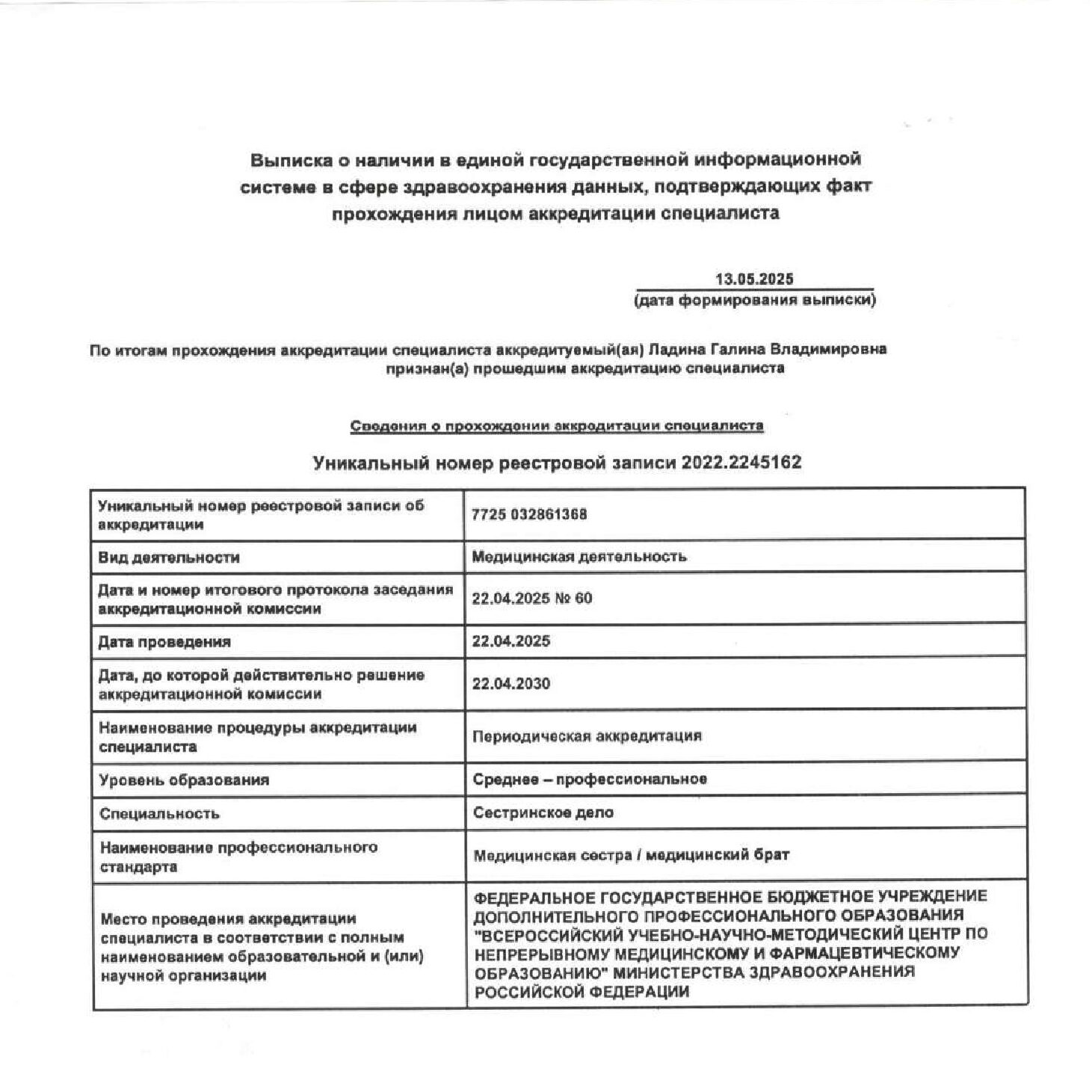 Ф.И.О. МЕДИЦИНСКОГО РАБОТНИКА: Ладина Галина Владимировна